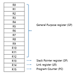 R0부터 R12 까지는 General Purpose(GP) Register, 즉 범용적으로 사용할 수 있는 register를 나타낸다. 이때 범용적이라고 함은 이 register field에 어떤 data가 담길 수도 있으며, 혹은 어떤 영역을 가리키는 address가 들어갈 수 있다는 것이다. R13은 Stack pointer(SP)이며, 보통 프로그램 구동시 필요한 Stack의 top을 가리키는 index를 담고 있다. R14는 Link Register 인데, 만약 어떤 함수가 호출될 경우 함수의 return address를 담고 있다. 물론 return address 뿐만 아니라 interrupt 같은 exception을 다룰때도 사용되기도 한다. 마지막으로 R15는 Program Counter(P..