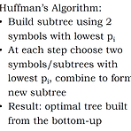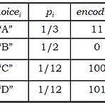 이전 포스트에서 일종의 binary tree형식으로 bit을 나열해서 Variable Length Encoding을 구한다고 언급했었는데, Tree를 만드는데도 일종의 규칙같은게 있다. Huffman`s Algorithm이라는 것인데, 한번 잠깐 소개해보고자 한다. 우선 Logic은 다음과 같다. 일단 앞의 예제를 그대로 가지고 오는 것을 생각해보자. 위에서 맨처음 스텝에 언급한 것처럼 가장 작은 확률을 가진 symbol 2개를 바탕으로 하나의 subtree를 만든다. 그러면 이렇게 된다.( 우선 C와 D의 순서는 상관없다. 같은 확률을 가지고 있기 때문에 표현하기 좋게 순서대로 나열한 것일뿐 D가 먼저와도 상관없다.) 그러면 이 subtree내의 확률들을 합쳐서 그 다음 노드에 정의를 하고 그 값을 현..