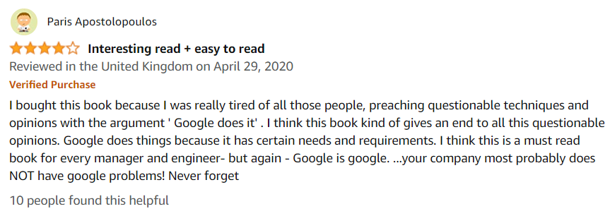 사실 이 리뷰가 어떻게 보면 책의 목적을 대변하고 있다고 생각한다. 앞에서 서두에 했던 말처럼 "그냥 구글이 이렇게 하니까 이게 진리다!" 라는 인식보다는 왜 구글이 이런 방법론을 택하고 발전시켰는지에 대한 생각을 해볼 필요가 있다고 생각한다. 그런 점에서 이 책은 무조건 구글! 이 아닌 그 근거에 대해서 장문의 페이지를 통해서 설명하고 있는 셈이다. (어쩌면 구글에서 하고 있는 방식은 구글이 다루는 문제에서 유용한 것이지 실제 우리같은 회사한테는 overkill일 수도 있겠다.) 개발하는 사람이나 그 사람들을 관리하는 PM들한테는 이런 부분을 책읽으면서 와닿지 않을까 하는 생각을 한다.