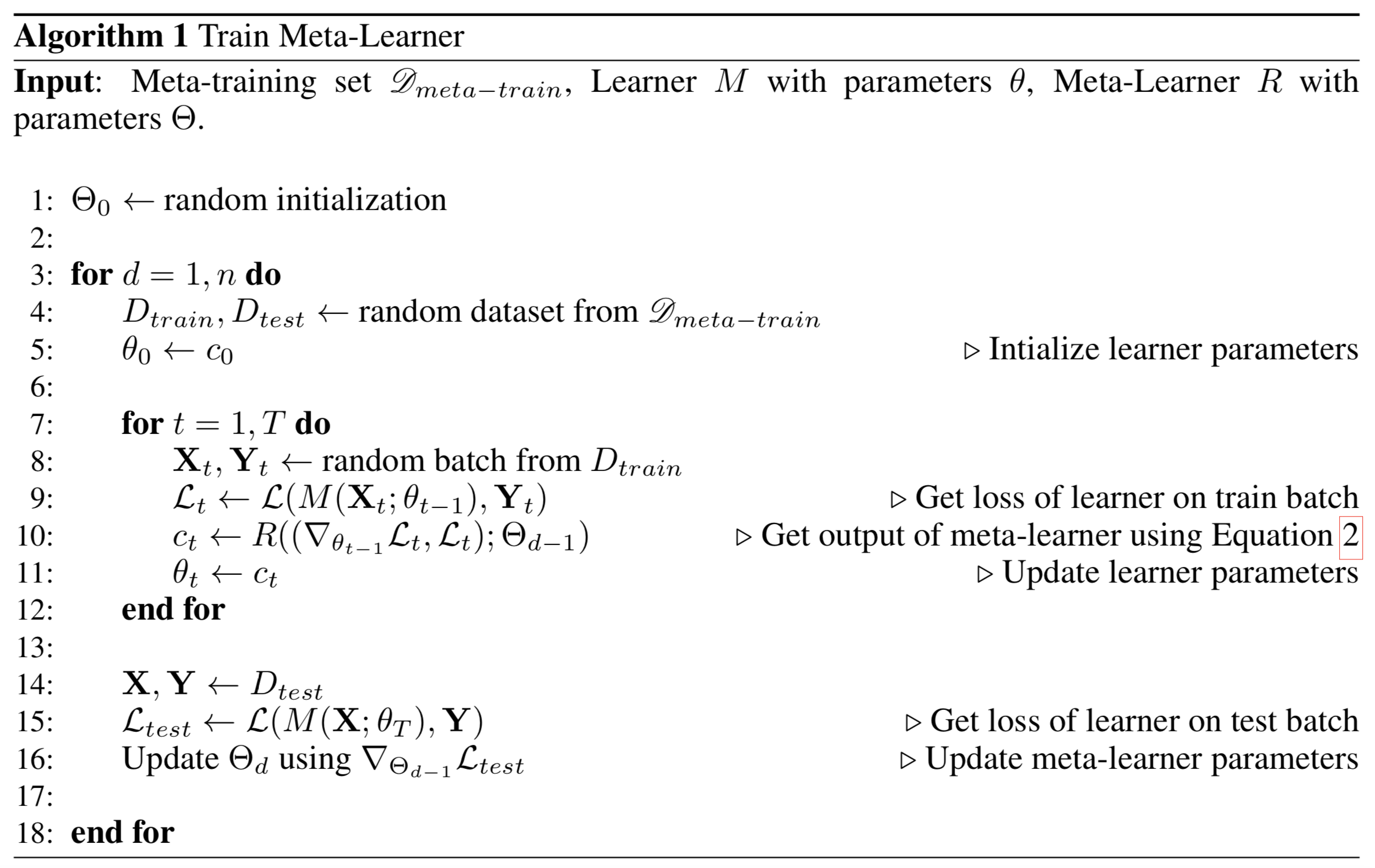 - 한편, optimizer \(g_{\phi}\)는 주어진 support set \(S\)를 가지고, learner model의 parameter를 update하는 방법을 학습하게 된다.