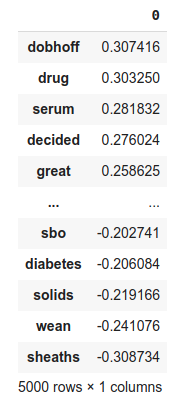 아무튼 위와 같이 vectorizer로부터 keyword를 뽑아낼 때, 적절한 함수를 사용해야 원하는 결과를 도출할 수 있다. 이런 식으로 coefficient기반으로 어떤 keyword가 예측에 영향을 주는지를 판별할 수 있는 것을 확인할 수 있었다.
