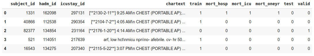 이 중 우리가 관심있는 column은 chartext와 mort_hosp이다. (여기서 train,test,valid column은 단순히 데이터 구분을 위한 column이고 나머지는 관심이 없거나 학습에 영향이 없는 변수들이다)