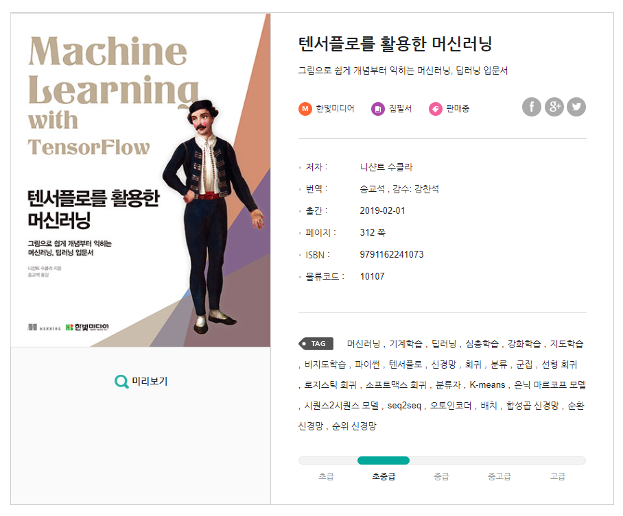 “이 책은 텐서플로를 활용해 머신러닝부터 딥러닝, 넓게는 강화학습까지 데이터 과학 분야를 전반적으로 다루는 입문서입니다. 물론 시중에도 머신러닝이나 텐서플로 관련 입문서가 참 다양하게 있습니다. 하지만 『신경망 첫걸음』, 『처음 배우는 인공지능』, 『강화학습 첫걸음』을 번역하신 송교석 역자님의 독자를 배려한 번역은 여타 입문서와 비교할 수 없는 장점이 아닐까 생각합니다. 더불어 실제 동작하는 예제를 실행해보면서 텐서플로에 대한 이해를 높일 수 있어, 막 중급으로 진입하려는 개발자와 학생들에게 큰 도움이 될 것입니다.”