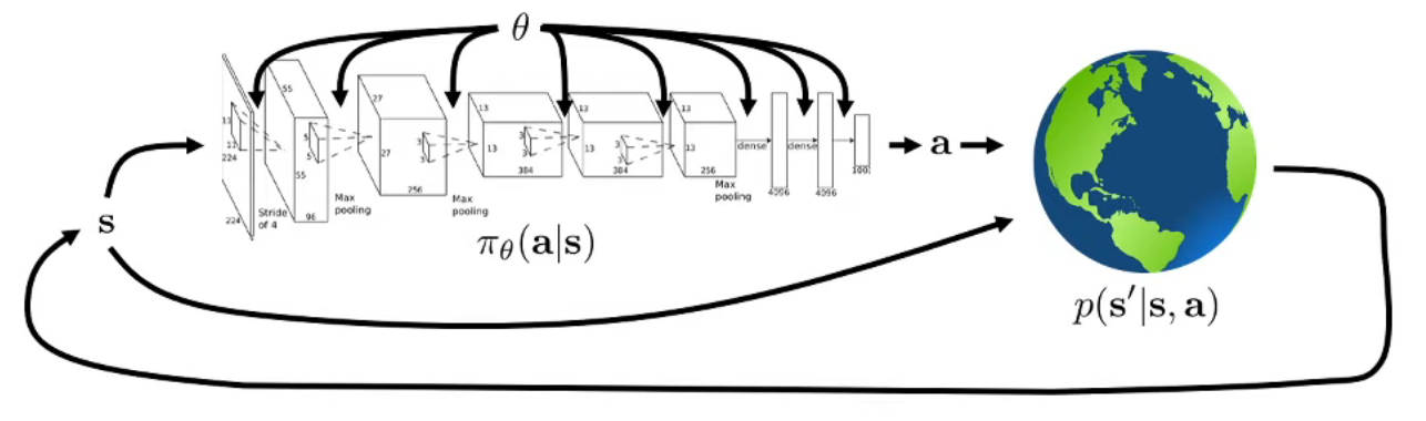 이 강의 주제는 신경망을 활용한 강화학습을 다루는 것이다. 강화학습의 목표라고 하면 어떤 환경에서 잘 동작하는 policy를 찾는 것인데, Deep RL에서는 이 policy가 신경망으로 표현된다. 그래서 이 policy를 \(\pi\)라고 표현한다면, 신경망의 weight \(\theta\)에 의해서 어떤 policy인지 결정되기 때문에 일반적으로는 \(\pi_{\theta}\)라고 표기한다. 그리고 추가로 policy의 역할은 어떤 state에서 어떤 action이 가장 좋은 것인지를 결정하는 일종의 원칙이기 때문에, 이를 신경망으로 표현한다면 state를 input으로 받고, action을 output으로 내보내는 형태로 생각해볼 수 있다. 결과적으로 어떤 상태일때 특정 행동을 취할 확률로 policy를 나타내기에, 이를 조건부 확률 \(\pi_{\theta}(a \vert s) \)로 표현하게 되고 이렇게 놓고 보면 결국 policy는 특정 state \(s\)에서 취할 수 있는 action \(a\)에 대한 확률 분포라고 설명할 수 있다. 참고로 agent가 전지전능한 신이 아닌 이상 모든 state를 관찰할 수 없기 때문에, 만약 실제 환경에 적용할 것을 가정한다면 partially observable한 state, 다르게 말하면 observation으로 표기해야 하지만 우선 설명 부분에서는 모든 state를 관찰할 수 있는 것을 가정하고 시작한다.
