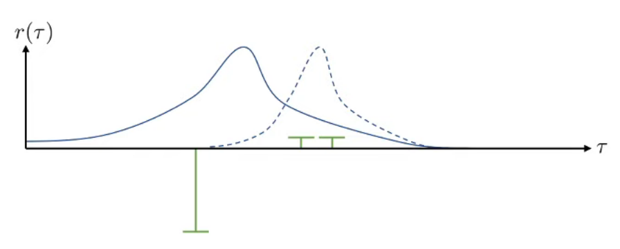 앞에서 언급했던 것처럼 policy gradient는 'trial-and-error' 방식으로 학습하면서 good trajectory를 만든 policy를 자주 수행하고, bad trajectory를 만드는 policy는 덜 수행하는 방향으로 update된다. 참고로 위의 그래프에서 초록색 bar는 해당 trajectory의 reward값 \(r(\tau)\)를 나타낸 것이고, 파란색 curve는 해당 trajectory의 policy인 \(\log\pi_{\theta}(\tau)\), 즉 log probability를 나타낸 것이다. 그러면 negative reward를 받은 trajectory에 대한 log-probability는 낮아지고, positive reward를 받은 trajectory에 대한 2개 샘플의 log-probability는 커질 것이고, 결과적으로 distribution이 점선처럼 이동하게 된다.