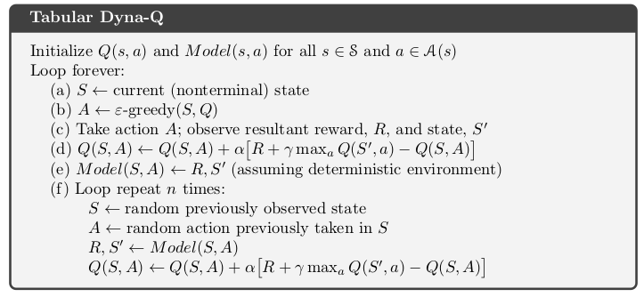 Q-Planning 과정이 (f)인데, 이때 model을 update할때 사용되는 State \(S\)와 Action \(A\)이 각각 previously observed state, action previously taken in \(S\) 로 되어 있다. 이 말은 결국 Dyna-Q에서 Planning 수행시 model update는 이전에 수행했던 state action transition, 다르게 표현하면 이전에 수행했던 경험에 대해서만 이뤄진다는 것이다. 위와 같이 동작한다면, 초반에 model이 incomplete한 상황에서는 Q-planning이 거의 이뤄지지 않겠지만, state action transition이 많이 수행되면 Q-planning도 다양한 State와 Action내에서 이뤄지면서, 그만큼 맨처음에 언급했던 inaccurate model을 다룰 수 있게 된다.