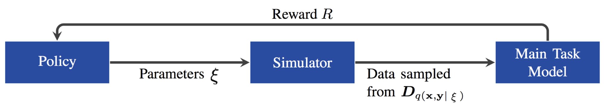 Ruiz et al(2019)에서는 task feedback은 강화학습의 reward로 간주했고, 이에 따라 \(\xi\)를 조절하는데 있어 강화학습 기반의 방법을 제안했는데, 이름이 "learning to simulate"였다. 이 방법에서 policy는 main task의 validation data에서 뽑을 수 있는 performance metric을 reward로 이용해서 \(\xi\)를 predict하도록 학습되었고, 이건 multivariate Guassian 분포를 띄게끔 모델링된다. 전반적인 아이디어는 data generation을 하는데 NAS를 사용한다는 점에서 AutoAugment와 유사하다. 논문에서 진행한 실험에 따르면 main task model이 어느 특정 범위로 수렴하지 않더라도, data generation policy한테는 의미있는 정보를 제공할 수 있다고 알려져있다.