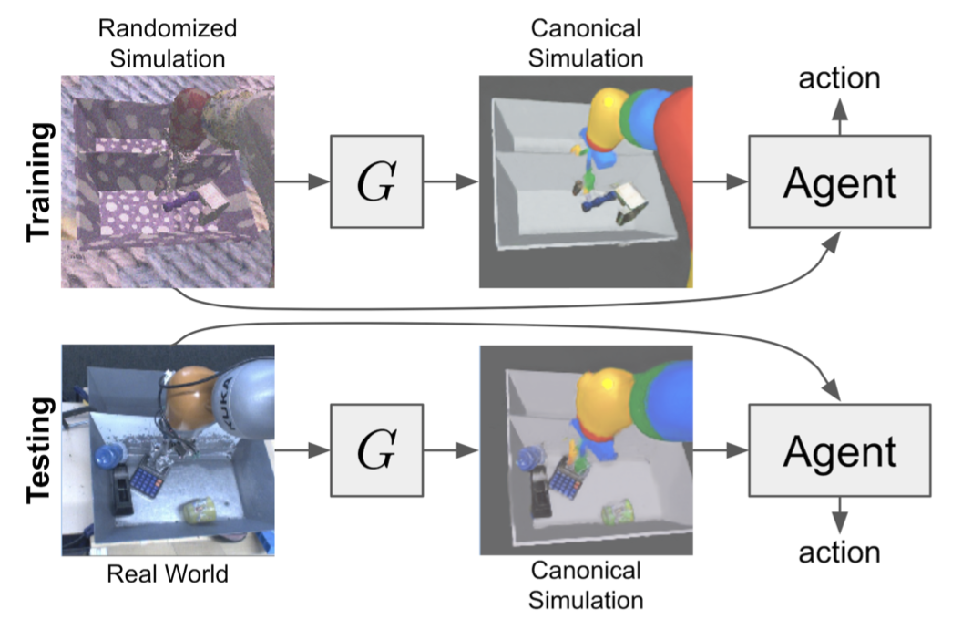 RCAN (James et al, 2019) 은 "Randomized-to-Canonical Adaptation Networks"의 줄임말인데, end-to-end RL task에서 DA와 DR을 적절하게 조합해서 사용했다. image-conditioned GAN(cGAN)은 domain-randomized image를 non-randomized한 형태(보통"canonical version"이라 표현하기도 한다)로 전환시키기 위해 simulator에서 학습시킨다. 이후 같은 모델을 사용해서 실제의 이미지를 이와 관련있는 시뮬레이션 환경의 이미지로 전환시키는데, 이를 통해 agent가 학습과정에서 어떤 정보와 맞닿는지에 대해서 지속적으로 관찰할 수 있게 해준다. 여전히 여기에 깔린 가정은 domain-randomized한 시뮬레이션 이미지의 분포가 실제 환경에서 뽑은 이미지를 설명할 수 있을만큼 충분히 광범위해야 한다는 것이다.