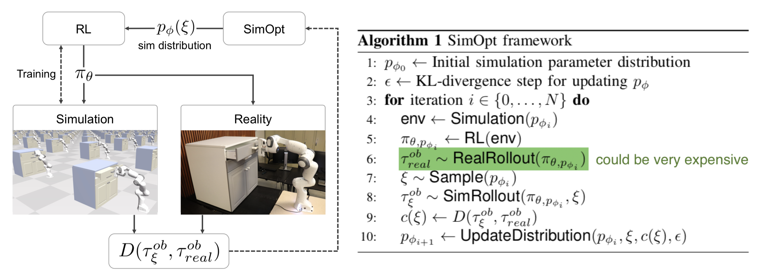 SimOpt 모델 (Chebotar et al, 2019) 먼저 특정 policy \(\pi_{\theta, P_\phi}\)를 구하기 위해서 초기의 randomization distribution \(P_{\phi}(\xi)\) 상에서 학습시킨다. 그리고 난후 해당 policy를 simulator와 실제 로봇상에 반영시켜서 각 환경에 대한 trajectory \(\tau_\xi\)와 \(\tau_{\text{real}}\)를 모을 수 있도록한다. 이때 optimization object는 simulator와 real environment로부터 수집한 trajectory사의 불일치성을 최소화하는 것이 된다.