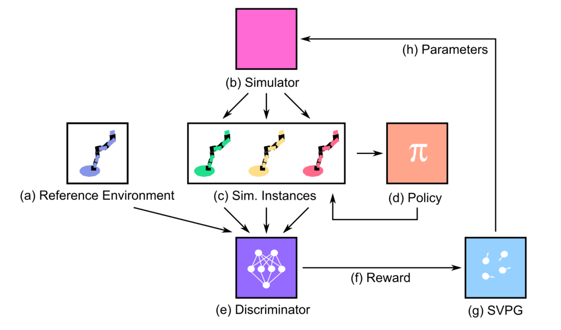 - 만약 환경이 학습하기 쉬울 경우, 같은 policy agent는 reference에 대해서 거의 비슷한 trajectory를 만들어낼 것이다. 그럴 경우 모델은 더 다른 행동을 유발해서 조금 더 어려운 환경에 대해 탐색하고 보상할 수 있어야 한다. - discreminator에 의해서 계산된 reward는 Stein Variational Policy Gradient (SVPG) particle의 입력으로 들어가 특정 randomization configuration의 형태로 출력되게 된다.