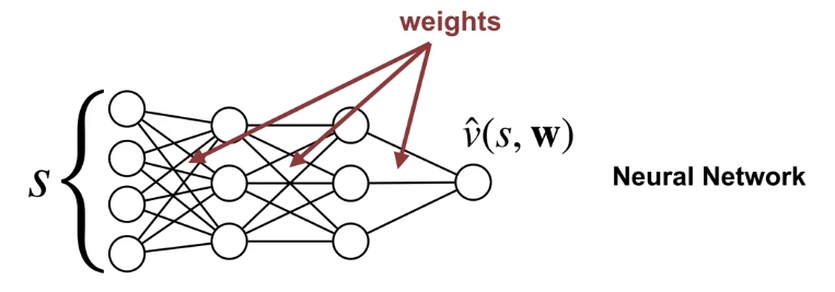 $$ \hat{v}(s, \mathbf{w}) \approx v_{\pi}(s) $$