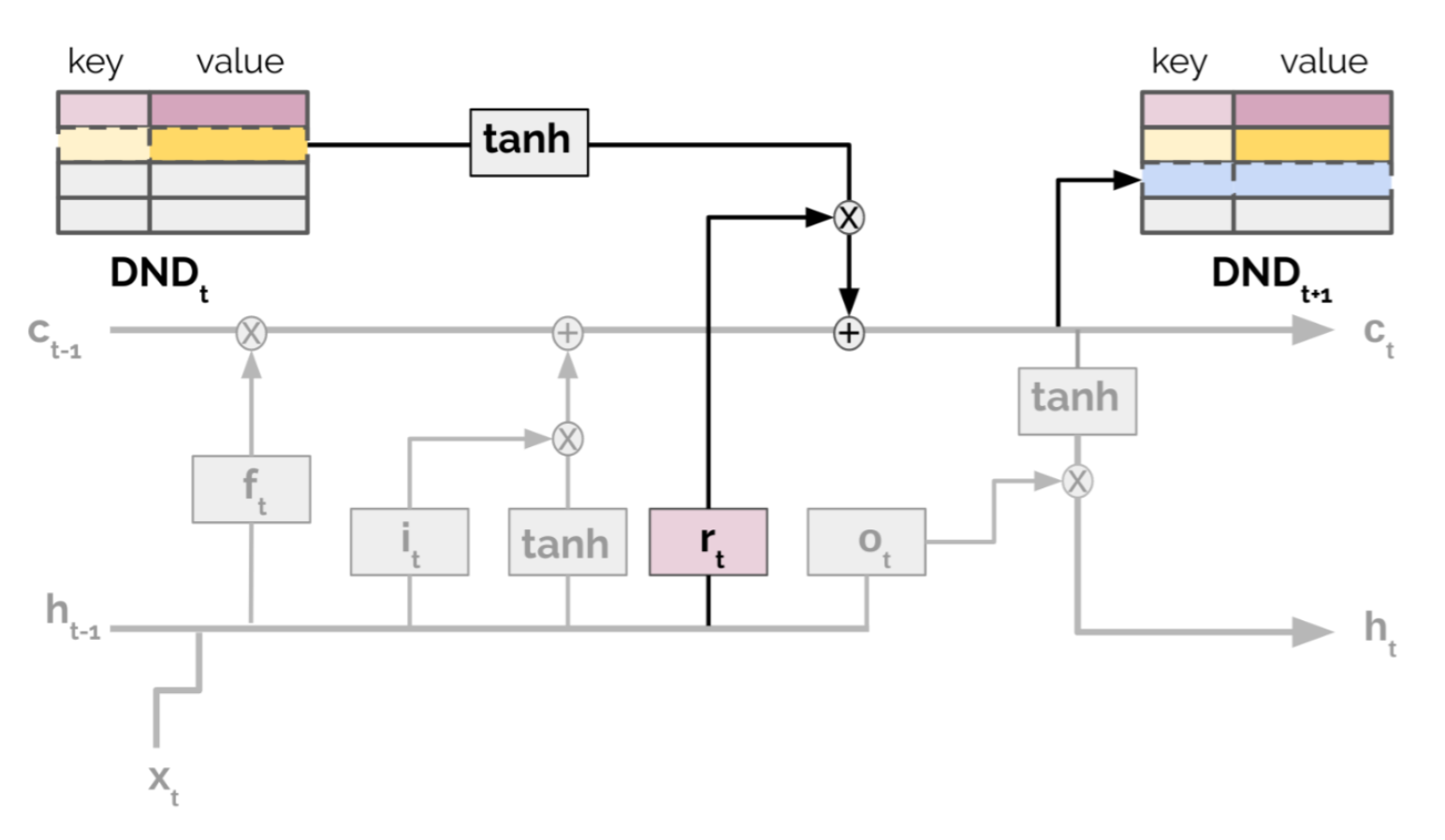 여기서 좀더 나아가, Episodic LSTM (Ritter et al, 2018)은 기본적인 LSTM 구조에 DND episodic memory를 추가한 것인데, 여기서 memory내에는 task context embedding을 key로 저장하고, 이에 따른 LSTM cell의 state를 value로 저장된다. 저장된 hidden state는 기존 LSTM에서 발생하는 gating mechanism과 동일한 과정을 거쳐서 다시 되돌아가 현재의 cell state에 직접적으로 대입된다.