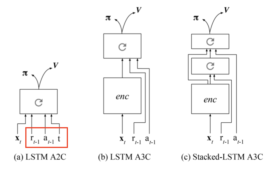 - meta-RL : \(pi_{\theta}(a_{t-1}, r_{t-1}, s_t) \rightarrow \mathcal{A} \)에 대한 분포