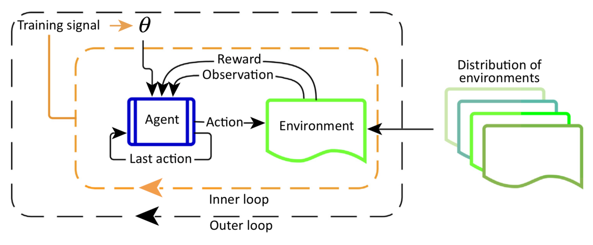 딥러닝이 활발히 개발되는 시점에, Wang et al, 2016 과 Duan et al, 2017은 거의 동시에 Meta-RL에 대해서 비슷한 아이디어를 내놨다. (두번째 논문은 보통 \(\text{RL}^2\)라고 부르기도 한다.) meta-RL 모델은 다양한 MDP에 대해서 학습하고, test 시점에서는 새로운 task를 빠르게 해결할 수 있게끔 학습한다. meta-RL의 목표는 일반적인 알고리즘을 한단계 넘어서는 의욕적인 것이었다.