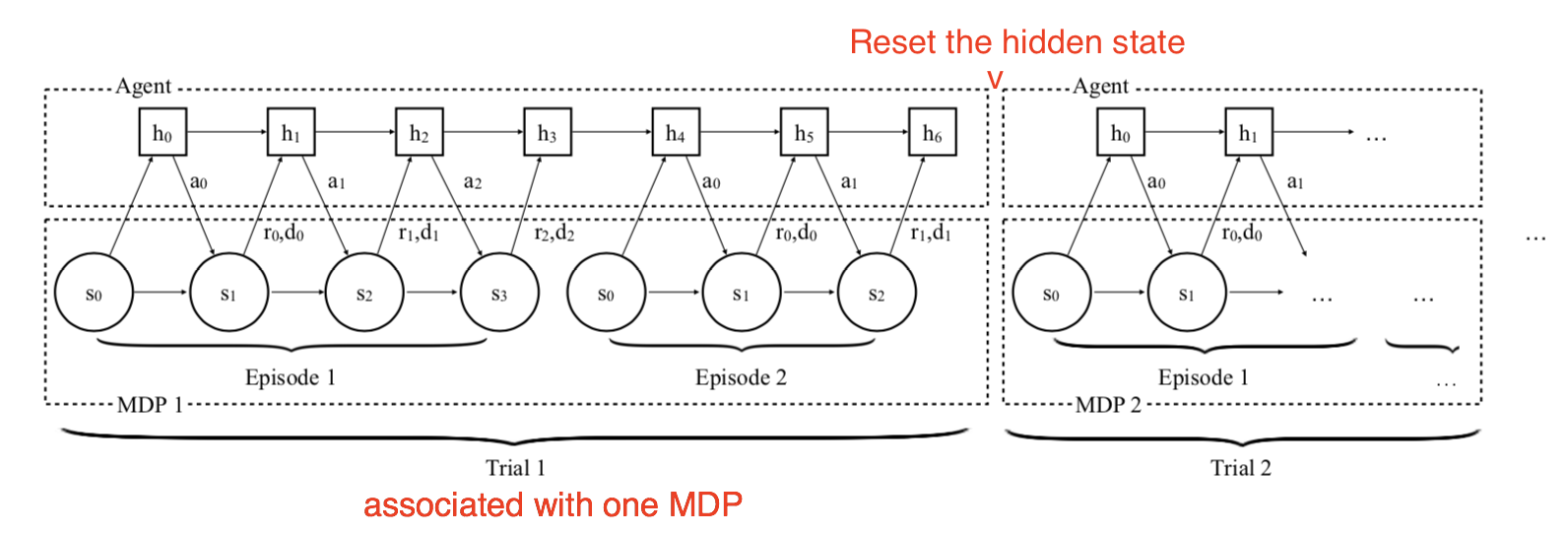 meta-RL의 전체적인 설정은 일반적인 RL 알고리즘과 매우 유사한데, 한가지 차이가 있다면 가장 마지막 reward \(r_{t-1}\)과 action \(a_{t-1}\) 또한 현재의 state \(s_t\)에 추가되어 policy observation에 사용된다는 것이다.