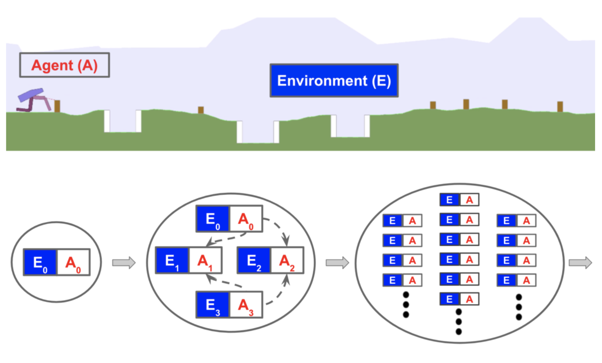POET (Wang et al, 2019) 은 evolutionary algorithm 기반의 framework로써, 문제들이 스스로 풀리는 동안 관련 task를 계속 생성해낸다. POET은 특별히 설계된 2D 환경의 bipedal walker에서만 구현되어 있지만, 좋은 방향을 제시하고 있다. 주목할만한 부분은 evolutionary algorithm이 앞에서 소개한 EPG나 PBT (Population-Based Training, Jaderberg et al, 2017)와 같이 Deep learning과 접목되어 좋은 결과를 보여주는 것들이 있다는 것이다.