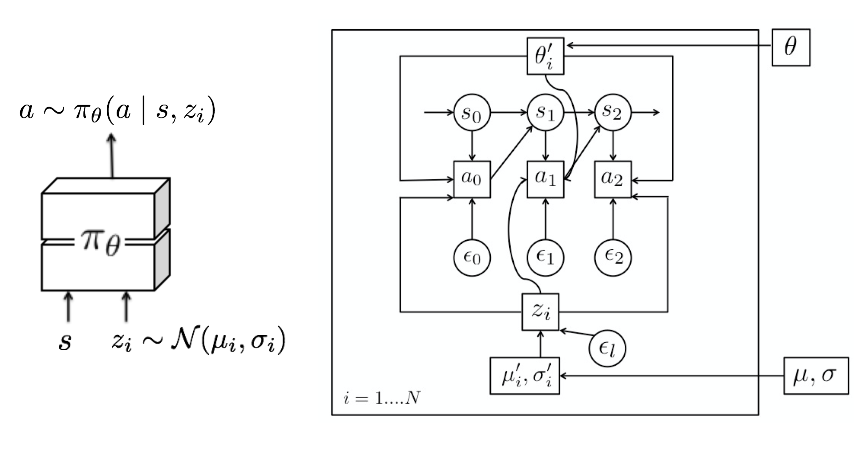 Model Agnostic Exploration with Structured Noise (MAESN) (Gupta et al, 2018) 은 이전에 쌓았던 experience 바탕으로 더 좋고 효율적인 exploration을 위해서 structured action noise를 학습하는 알고리즘이다. 간단하게 random noise를 action에다가 넣는것만으로는 task-dependent하거나 time-correlated한 exploration 방법을 구할 수 없다. MAESN에서는 \(i\)번째 task \(M_i\)마다 task에 따른 random variable \(z_i \sim \mathcal{N}(\mu_i, \sigma_i)\)를 갖는 policy로 변경하여, 이에 따라 변화된 policy \( a \sim \pi_{\theta}(a | s, z_i)\)를 얻어낸다. 여기에 latent variable(내장변수)인 \(z_i\)는 한번 샘플링되고, 샘플링된 시점에서의 에피소드에서는 쭉 고정된다. 직관적으로 놓고 봤을때, 이 latent variable는 에피소드가 진행되는 시점에 더 탐색이 이뤄져야 하고, agent가 이에 따라 action을 결정하는 일종의 behavior(or skill)을 결정하게 된다. 이를 통해서 policy parameter와 내장된 space 모두 total task reward가 커지는 방향으로 최적화된다. 반면, policy는 탐색을 위한 latent variable을 사용하는 방법을 학습하게 된다.