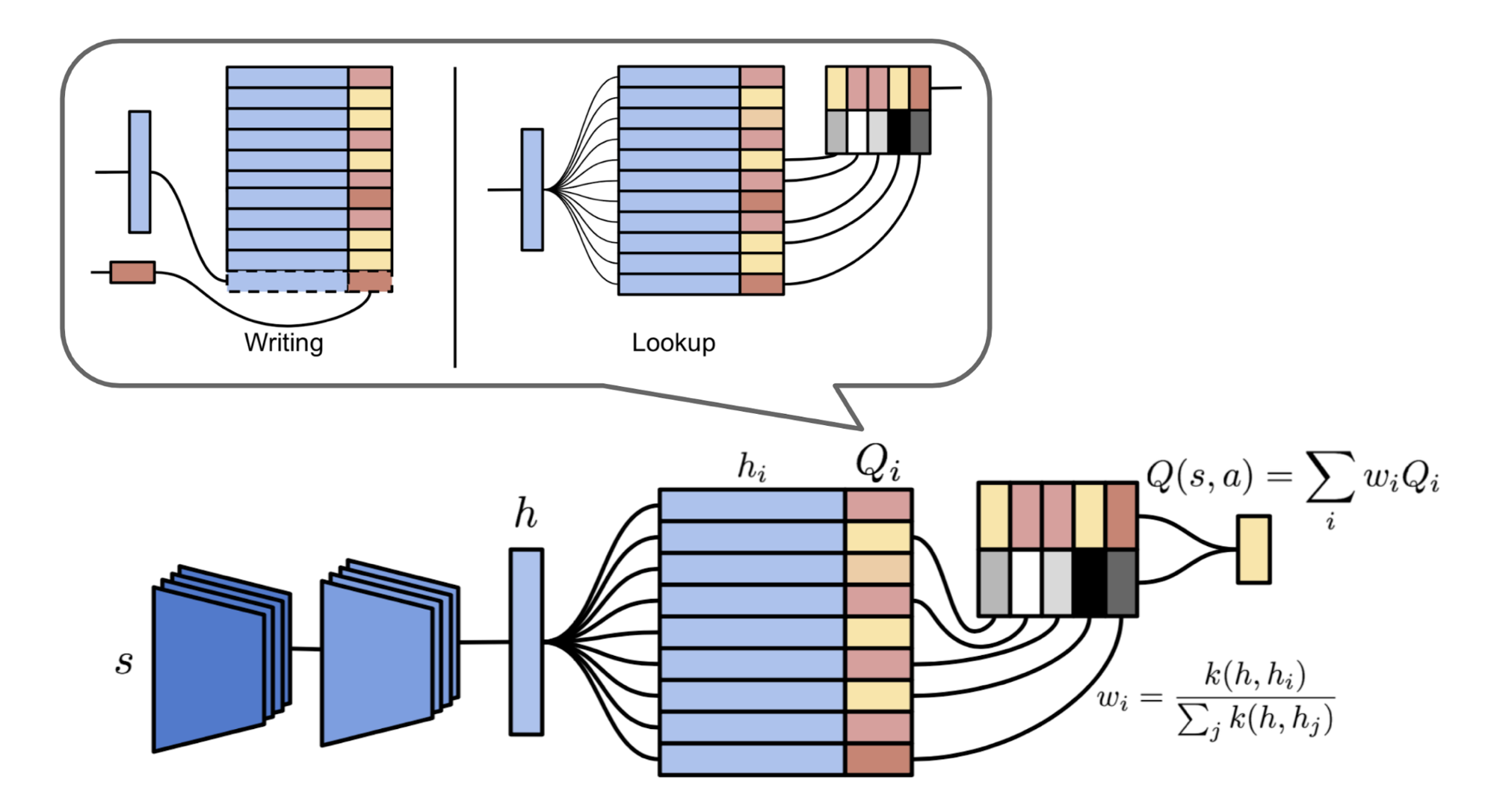 NEC에 내장된 episodic memory는 Differentiable Neural Dictionary (DND)(참고) 라는 것인데, 여기서 key는 input image pixel에 대한 convolutional embedding vector이고, value는 추정된 Q-value가 들어있다. 주어진 key를 이용해서, 가장 유사한 key들의 값에 대한 weighted sum이 output으로 나오게 되는데, 이 때 weight는 query key와 dictionary내에서 선택된 key간의 kernel measure를 normalize한 것이다. 이런 동작 방식이 일종의 hard attention machanism과 유사하다.