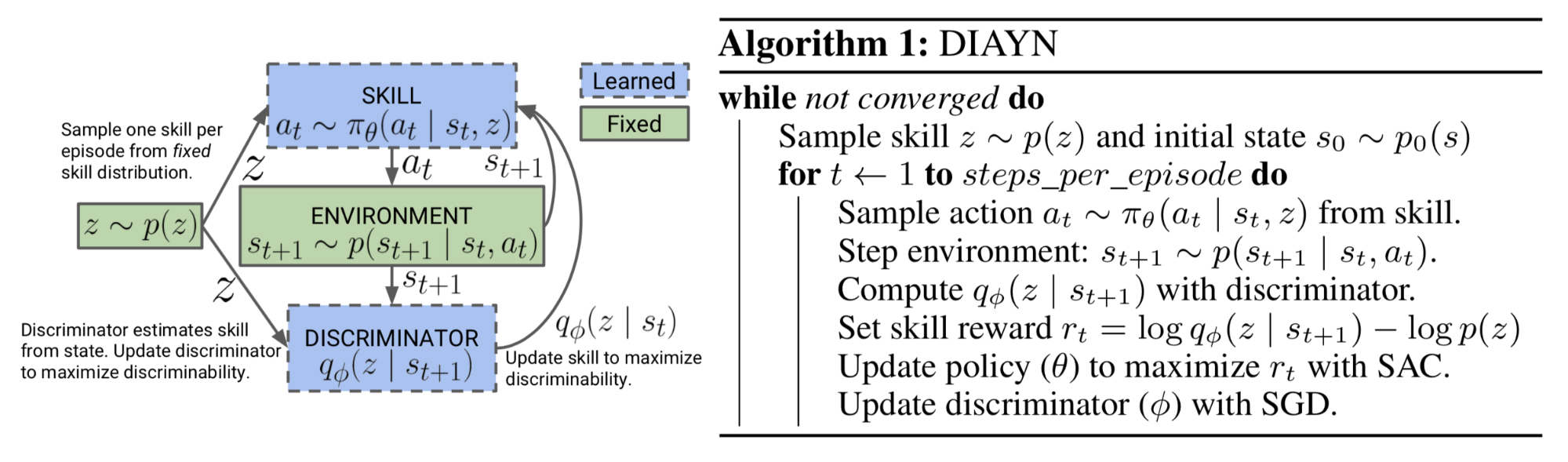 - Skill은 반드시 다양해야 하며, 이로 인해서 서로 다른 state들을 방문할 수 있어야 한다. 이를 통해 state와 skill간의 잠재적인 정보 (\(I(S;Z)\)) 를 최대화할 수 있다.