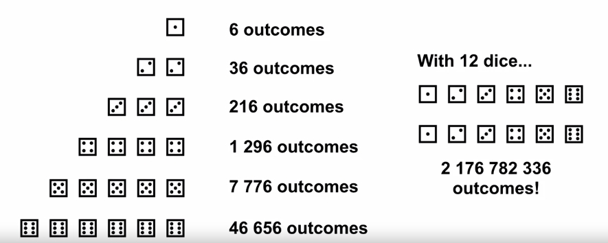 그런데 distribution model을 쓰는 경우, 하나의 주사위가 6개의 state를 가지고 있다는 것을 바탕으로 모든 경우에 대해서 고민해봐야 한다. 그래서 위와 동일한 12개의 주사위를 던지는 문제에서는 \(6^{12} \approx 2176782336\)의 경우의 수를 고려해야 한다. 단순히 계산하기 어려운 숫자지만, 이를 바탕으로 sample model에서 얻을 수 없는 전체 distribution에 대한 expectation이나, variance를 구할 수 있다.