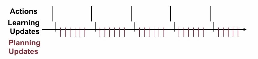 강의에서는 위의 도식표를 소개했는데, 위와 같이 Action과 Learning update 주기가 어느정도 term이 있다면, 그 term 사이에는 기존의 sample model에서 얻을 수 있는 data을 바탕으로 update할 수 있다는 것이다. 물론 model이 부정확할 수는 있어도, 어차피 Q-learning의 특성상 Q-value를 update할때 활용되는 값은 next state에서 뽑을 수 있는 Q-value (\(\max_{a}Q(S', a)\) )의 maximum 값이므로, 궁극적으로는 improve된 policy로 수렴하게 되는 것을 알 수 있다.