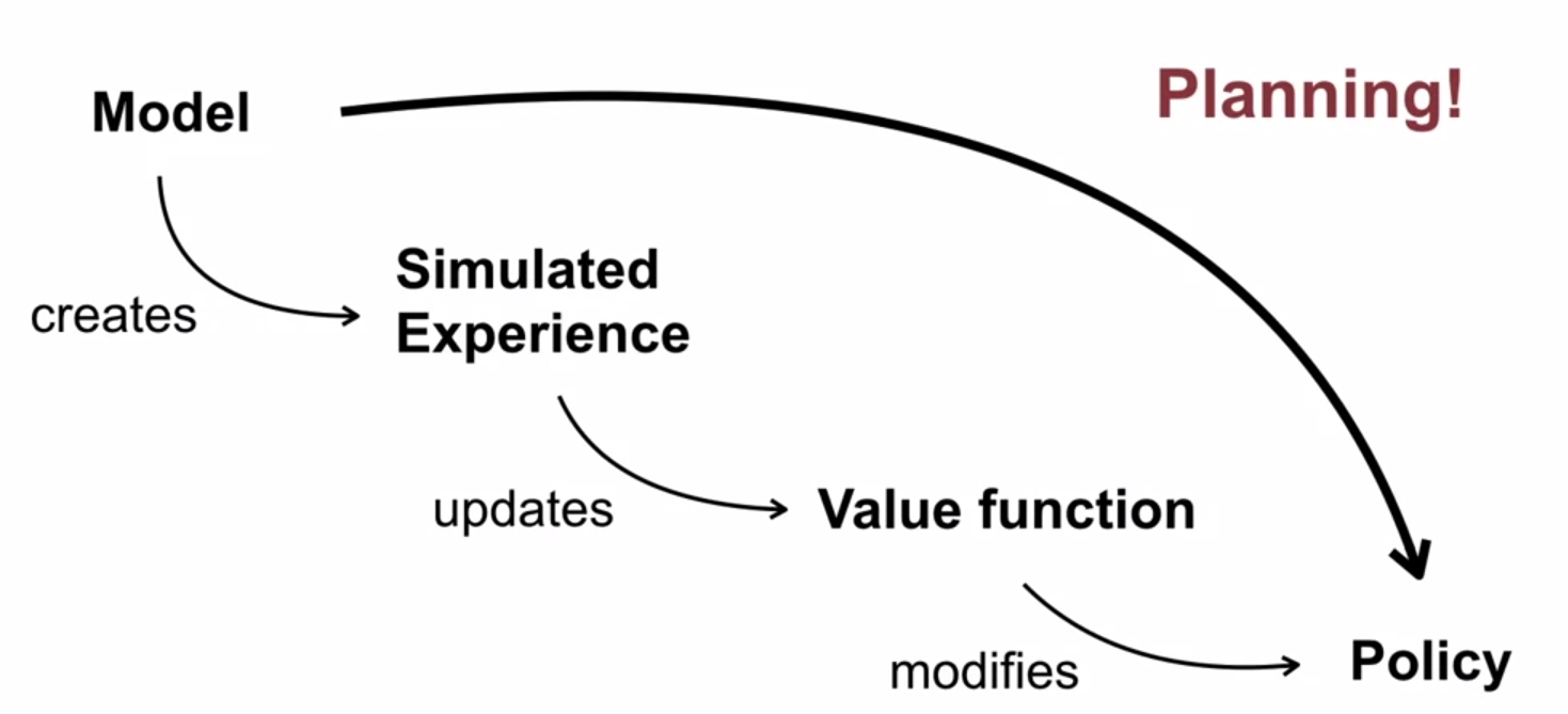 보통 강화학습의 본질은 environment의 dynamics를 이해시키는 것을 목적으로 하는데, Model은 이 dynamics에 대한 knowledge를 저장한 요소를 말한다. 간단하게 말하면 pure한 environment까지는 아니더라도, 나름의 reward function과 state transition을 통해서 next state와 받은 action에 대한 reward를 agent에게 전달해주는 역할을 한다. 그래서 앞에서 잠깐 이런 Model을 활용한 학습법인 Model-based RL은 planning에 초점을 맞추고 있다고 했는데, 이때의 Planning은 단어 뜻 그대로 어떤 action을 취하는데 있어, 좋은 reward를 얻게끔 policy를 개선하는 것이다. 이전 포스트에서 설명했던 Policy Improvement가 바로 model을 활용해서 planning을 수행하는 학습법이다. 그래서 Monte Carlo계열의 sampling이 반영된 알고리즘을 Model-based RL이라고 하는 것이다.