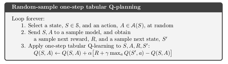 일단 앞에서도 소개했지만, Model이 있게되면 Planning이 가능해지고, 이를 통해 simulated된 experience를 생성할 수 있어 sample efficiency가 좋아진다고 했었다. 이런 개념을 이전에 다뤘던 Q-learning에 접목시킨 것이 Q-planning이다. sutton책에서는 매 step마다 table로 저장된 Q value를 sampling해서 그 값을 이용해 update한다는 내용을 담아 Random-sample one-step tabular Q-planning이라는 이름을 달았고, 알고리즘 내용은 다음과 같다. (참고로 Q-learning과도 비교해보았다.)