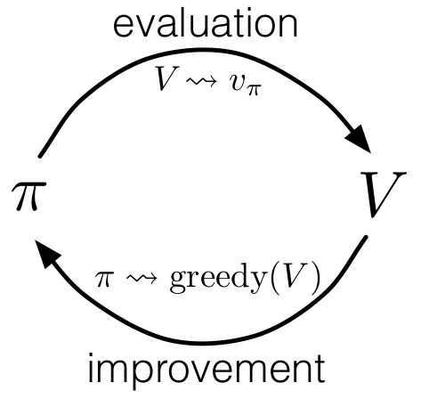 우선 Policy Evaluation에서는 현재의 policy \(\pi\)에 대한 State Value function \(v_{\pi}\)를 만들어주고, Policy Improvement에서 주어진 \(v_{\pi}\)에서 \(v\)를 최대화할 수 있는 greedy action의 집합 \(\pi'\)를 찾는 과정이 Policy Iteration의 개념이었다.