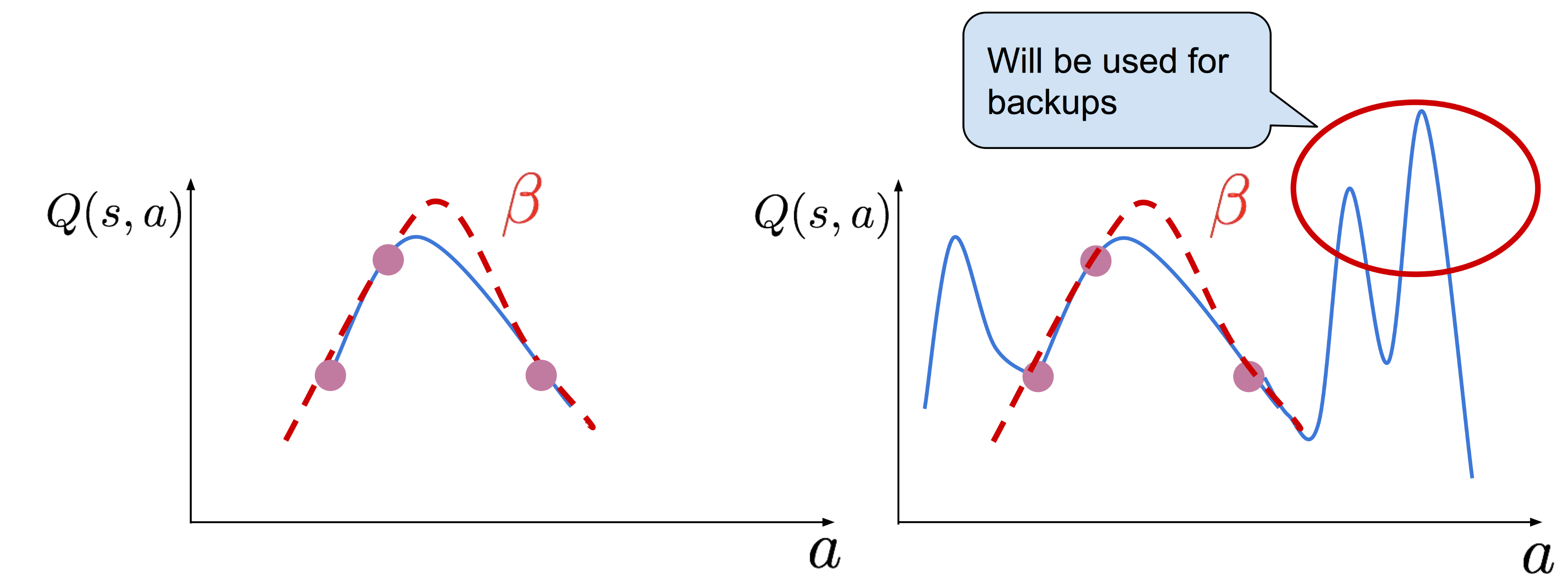 위의 그림 중 두번째 그림에서는 behavior policy \(\beta(a \vert s)\)에서 도출한 action들의 분포에서 벗어난 행동 \(a\)가 있다고 가정하고 이를 점선으로 표기했다. (참고로 OOD는 out-of-distribution의 약자이다) 불행하게도 그런 행동들이 매우 큰 \(Q(s, a)\)를 가진다면, Q-learning 에서의 갱신시 사용될 target을 만드는 bootstrapping 과정에서 사용되게 된다.