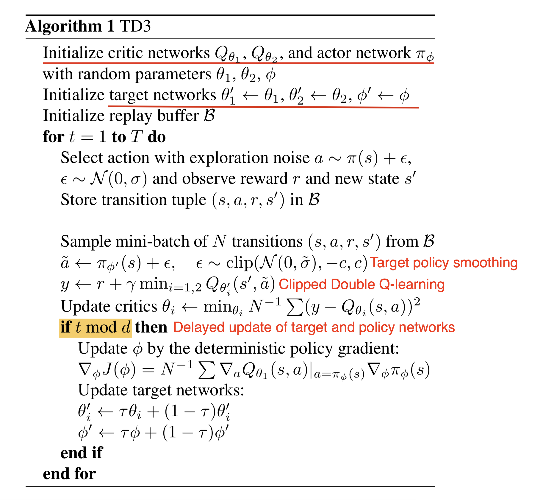 하지만, policy가 느리게 변화하기 때문에, 서로 independent한 decision을 하기에는 두개의 network가 너무 유사하게 된다. 이를 피하기 위해, Clippped Double Q-learning은 두 network 중 minimum estimation을 선택하게끔 해서 학습 도중에 벗어나는 것을 막는 underestimation bias를 선호하게 만들었다.