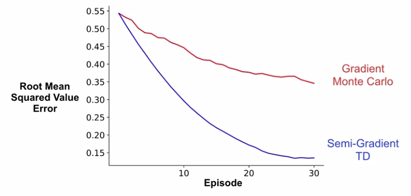 대신 역시 알고 있다시피 Semi-Gradient TD는 일반 TD와 같이 매 step마다 value function update가 이뤄지기 때문에 그만큼 Value Error를 빠르게 줄일 수 있다.
