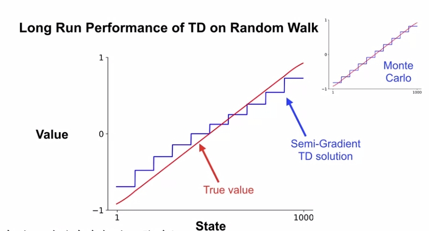 궁극적으로 위에서 구한 Semi-Gradient TD와 Gradient MC가 각각 실제 Value function과 어떤 차이를 나타내는지에 대해서는 다음과 같이 그래프로 확인할 수 있다.