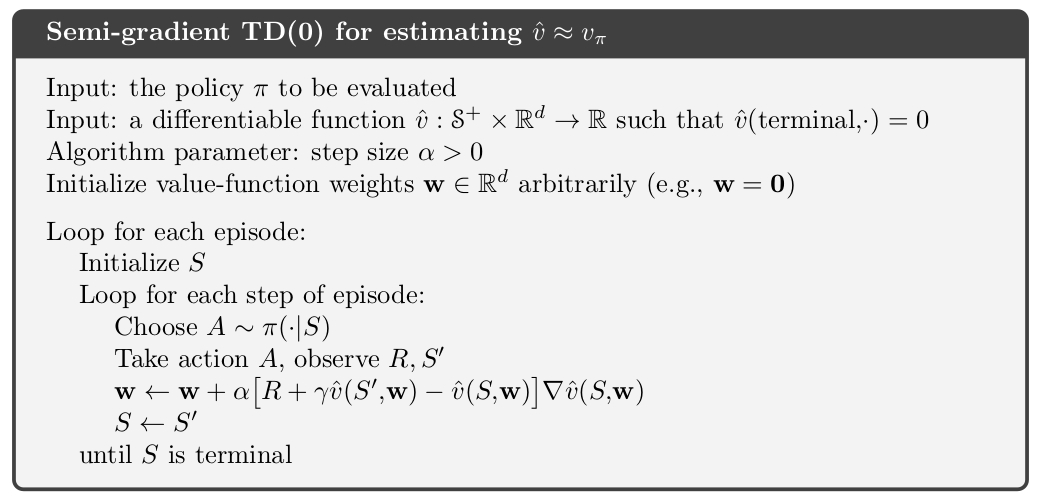 결국 TD learning에서는 Monte Carlo에서 취했던 것처럼 mean squared error에 대한 gradient descent를 통해서 weight를 update할 수 없다는 결론을 낼 수 있다. 간단히 말해서 Gradient Descent처럼 ground truth값이 고정되어야 있는 상황에서 TD learning에서는 TD Target 자체도 weight \(\mathbf{w}\)을 영향을 받기 때문에 bias가 생겨버리게 된다. 그래서 TD estimate에서는 weight의 gradient를 고려하되, TD Target에서는 Target의 gradient를 무시하는 취하는 방법을 취하곤 한다.(이렇게 해야 Target이 계속 변하는 문제를 완화시킬 수 있기에...) 이 방법을 Semi-Gradient(Bootstrapping) method라고 한다. 아래의 알고리즘은 기존의 \(\text{TD}(0)\)에 Semi-Gradient를 적용한 Semi-Gradient \(\text{TD}(0)\)이다.