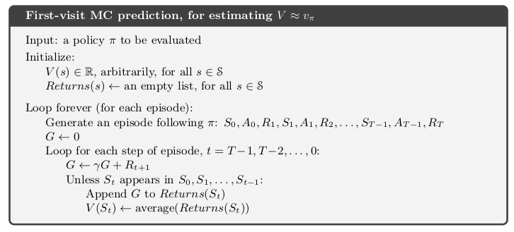 말은 즉, 현재의 policy가 \(\pi\)일때, 현재의 state가 \(s\)인 상태에서의 expected total reward \(G_t\)의 expected return을 나타 내는 것이다. 물론 total reward \(G_t\)로 계산되는 값의 갯수가 적으면 적을수록, 최종적으로 얻은 \(v(s)\)과는 거리가 멀겠지만, 갯수가 많으면 많을수록 그 sample들의 평균은 최종의 \(v(s)\)에 가까워질 것이다. 그대신 우리가 원하는 expected total reward가 최종의 것과 같은지를 확인하기 위해서는 일단 termination이 발생한 후에야 가능하다. (그래야 최종 값과 sampling average의 값을 비교해볼 수 있기 때문에) 그래서 Monte Carlo method는 episodic task, 즉 termination 조건이 있는 환경에서만 적용이 가능하다.
