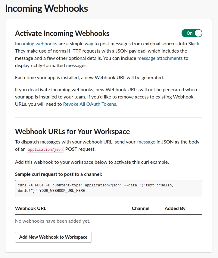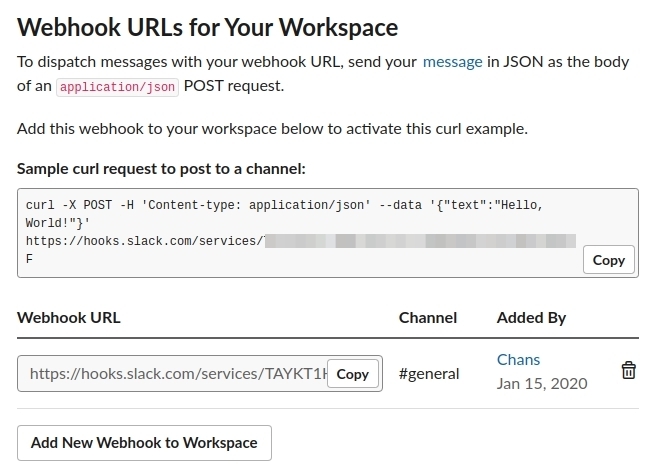 해당 기능을 On으로 바꿔주면 위와 같은 화면으로 바뀌게 되는데, 기본적으로 message는 json format으로 구성되어 post되는 형식으로 나간다. 그래서 자신이 보내고자 하는 데이터를 json으로 바꿔서 나름의 방법대로 전달해도 되고, 아니면 sample처럼 curl (command-line URL)을 사용해서 한줄로 간단하게 보낼 수 있다. 이제 해야 될건 webhook url을 얻는 것인데, 이는 아래의 Add New Webhook을 누르면 얻을 수 있다.