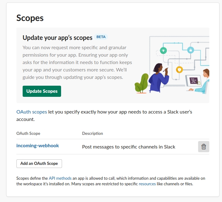 역시 webhook 설정과 마찬가지로 이 file upload를 위해서는 권한 설정을 해줘야 한다. 이를 지정하는 것이 Scope란 항목이다.